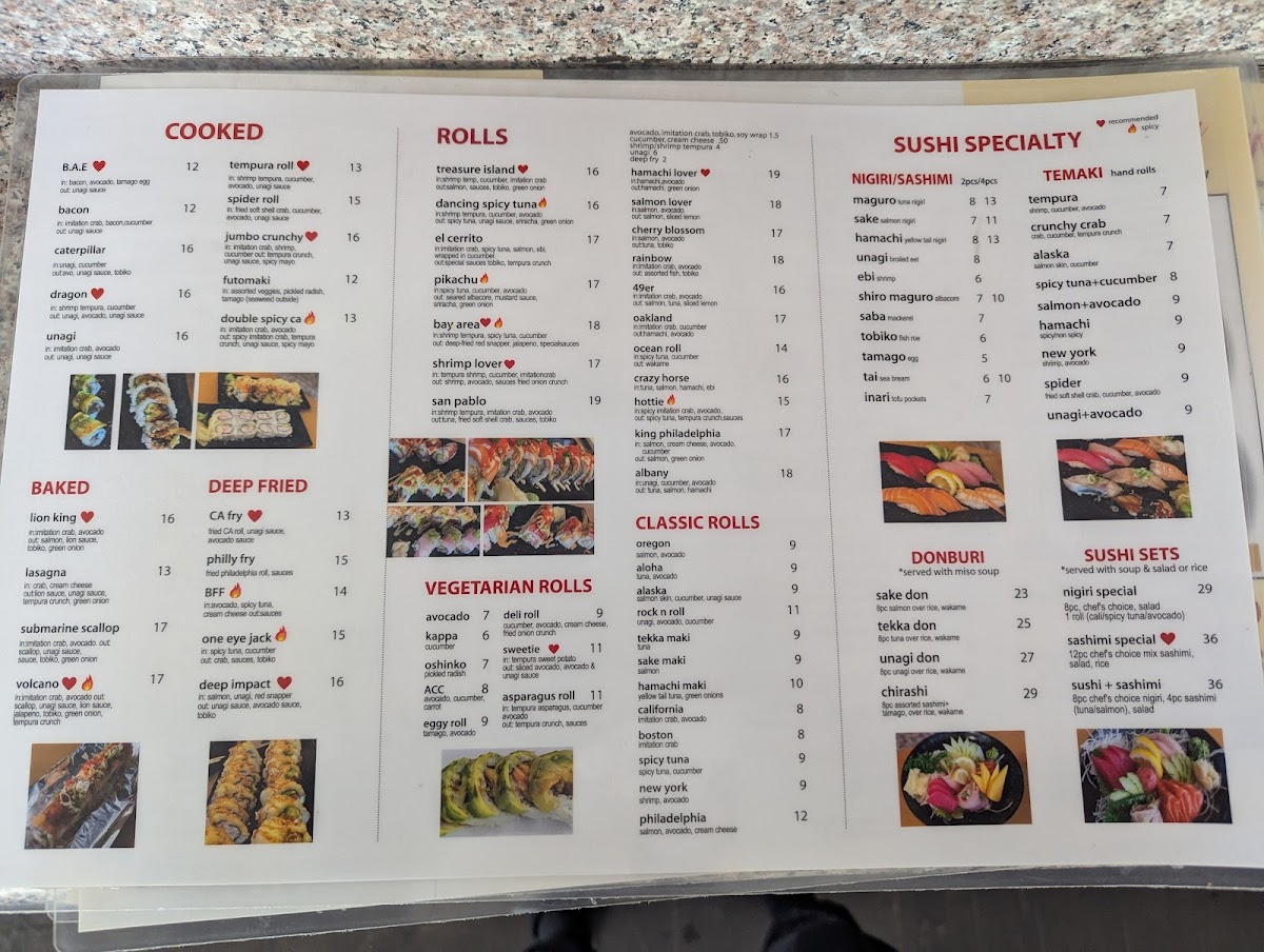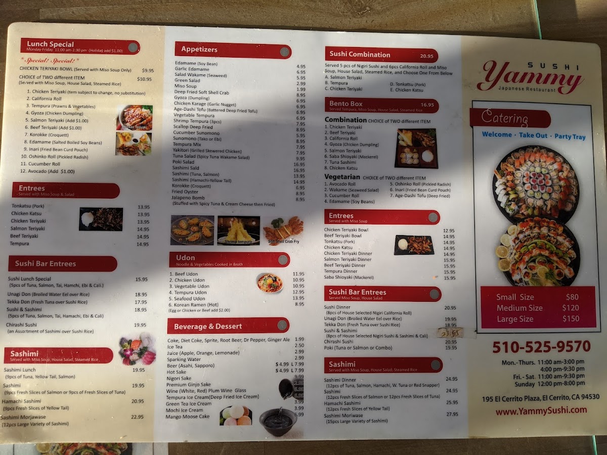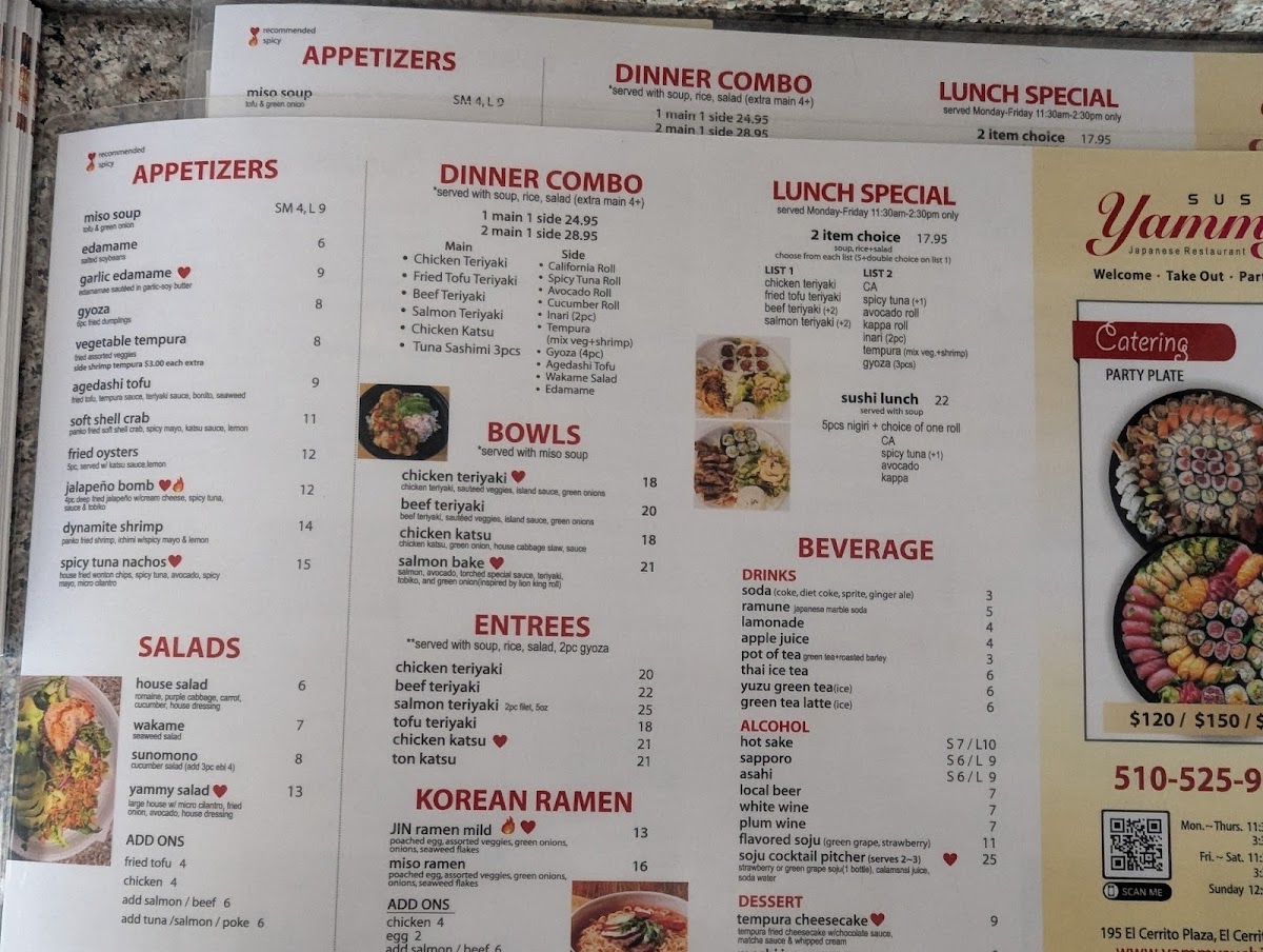 Located in the heart of El Cerrito Plaza, Yammy Sushi offers a delightful array of fresh, flavorful sushi and sashimi that is sure to satisfy any craving. Their extensive menu features dinner appetizers like the Sashimi Salad and Deep Fried Soft Shell Crab, showcasing a balance of textures and flavors, all at reasonable prices.
